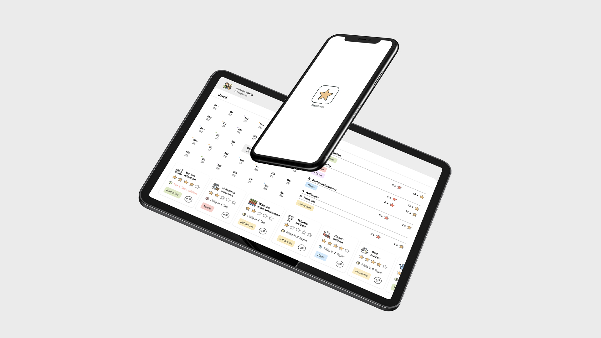 Questions over questions that can be solved by our prototype „Fairchores“. It helps newly formed shared flats and families to have an organized household, all in one app. Administrators of the household can distribute tasks and determine the difficulty by stars from 1 to 5, depending on the duration and effort.